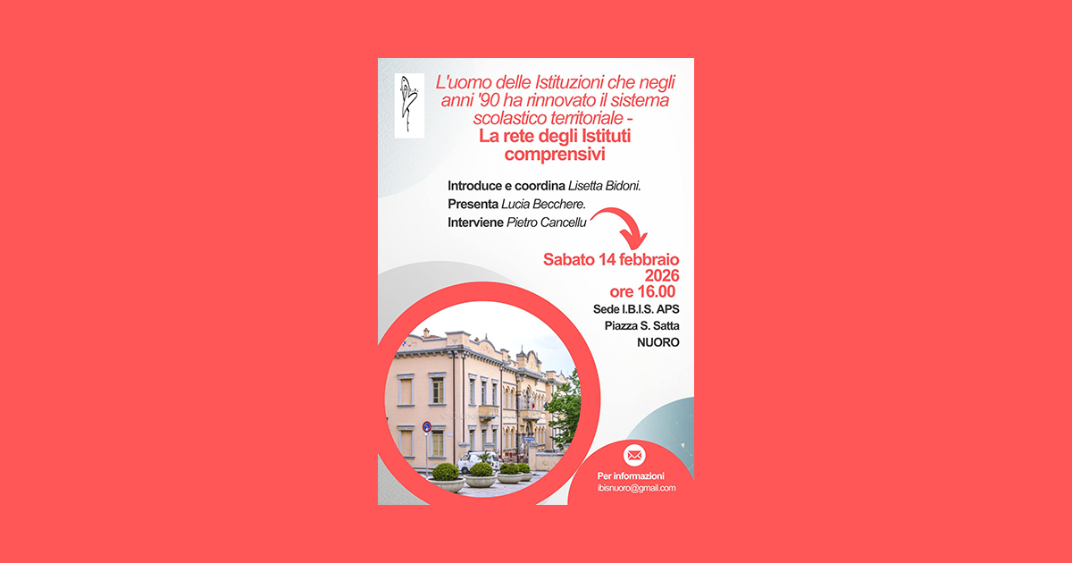 Sabato 14 febbraio, alle ore 16.00, presso la sede dell'Associazione I.B.I.S. in Piazza Sebastiano Satta, il dr. Pietro Cancellu, già provveditore agli studi Nuoro, con Lisetta Bidoni e Lucia Becchere ripercorrerà il grande fermento didattico organizzativo che negli anni '90 portò alla nascita degli Istituti Comprensivi, un modello di scuola sperimentato in Provincia di Nuoro e successivamente esteso a tutto il territorio nazionale. Un incontro molto interessante anche alla luce delle polemiche suscitate dalle misure di dimensionamento scolastico, che cancella in Sardegna nove autonomie scolastiche, di cui ben tre in provincia di Nuoro.